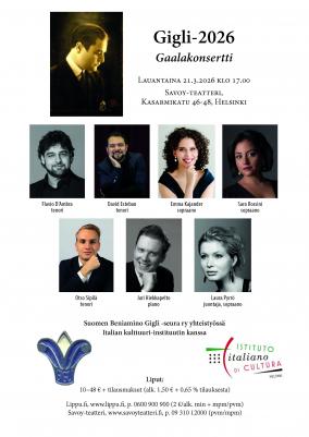 L’Associazione Beniamino Gigli in Finlandia organizza un concerto di gala in collaborazione con l’Istituto Italiano di Cultura di Helsinki sabato 21 marzo 2026 alle ore 17.00 presso il Savoy Teatteri di Helsinki (Kasarmikatu 46-48).
